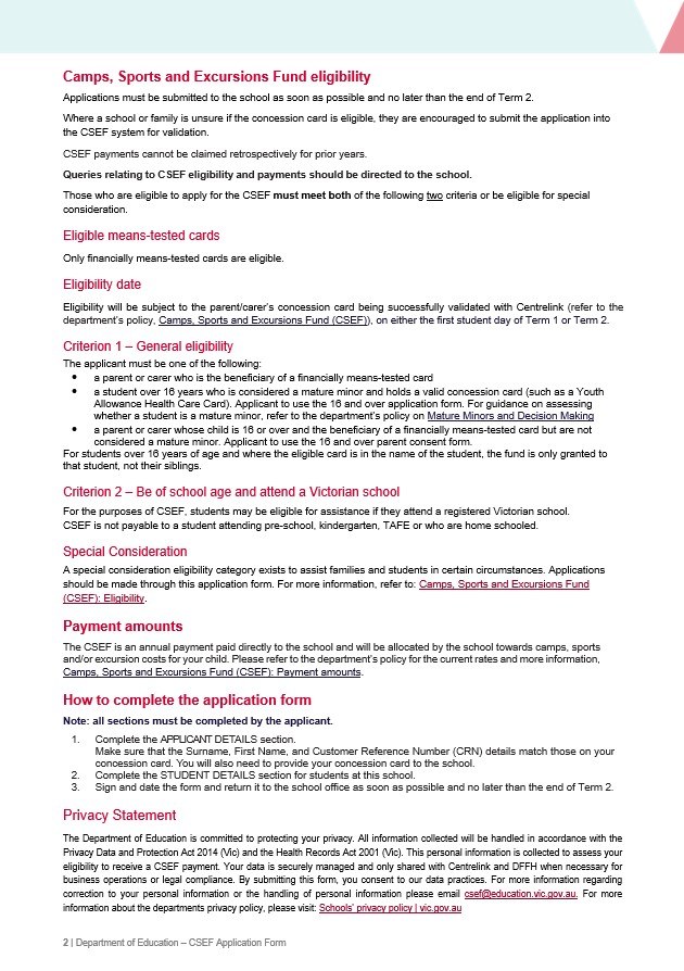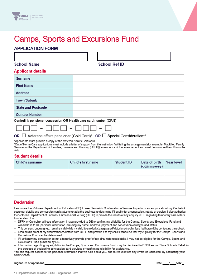 Schools can accept and process applications up until the end of term two each year. CSEF payments are made to schools from March onwards.