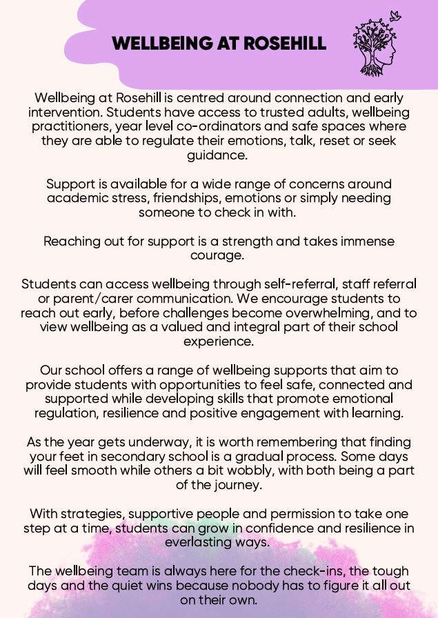 As we commence the 2026 school year, I warmly welcome all students, parents, carers and families to the Rosehill community. I extend a particular welcome to those students joining us for the first time, especially our Year 7 students, who are beginning an exciting new chapter as they transition into secondary education. This is a significant step in their learning journey, and I congratulate them on reaching this important milestone.