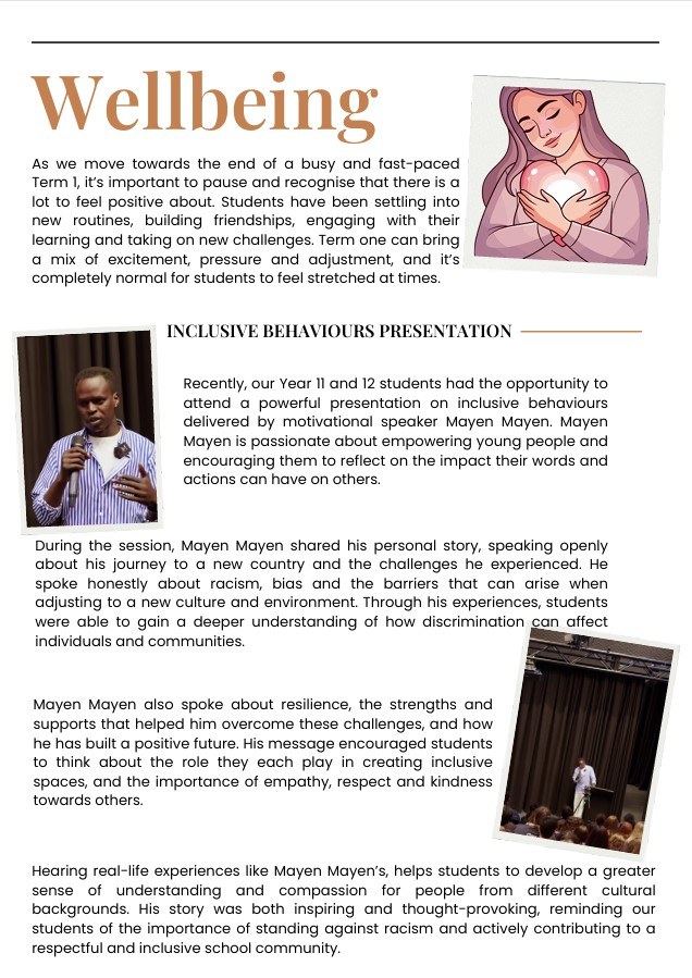 As we reach the end of a highly productive and rewarding Term 1, I would like to wish all members of our college community a safe, restful, and happy holiday break. The Term 1 holidays provide an important opportunity for students, staff, and families to recharge after what has been an incredibly busy and successful start to the year.